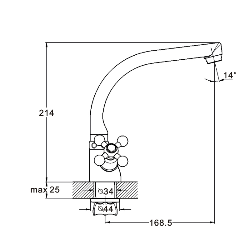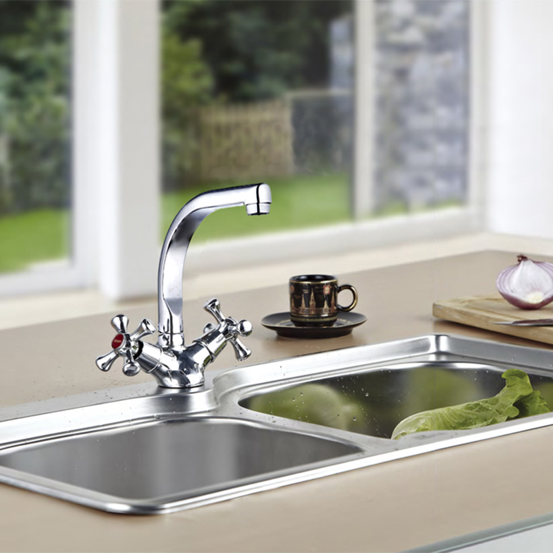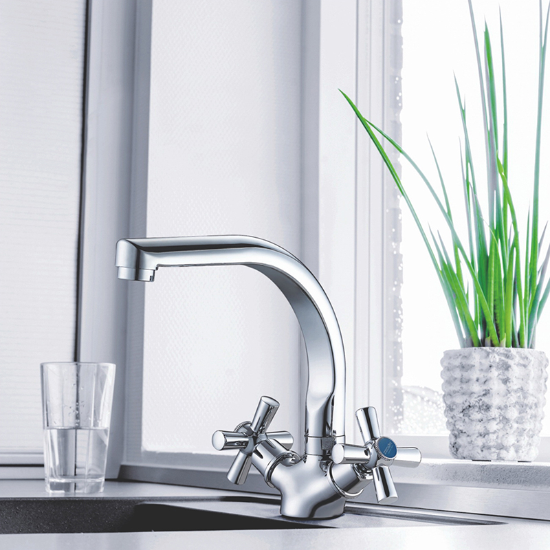 Baterie pentru bucatarie, cu doua ventile. Carcasa calitativa va asigura utilizarea durabila a bateriei. Se utilizeaza bucsa ceramica, cu potenţial inalt, la fel aeratorul, care imbunatatește calitatea apei și reduce consumul ei.