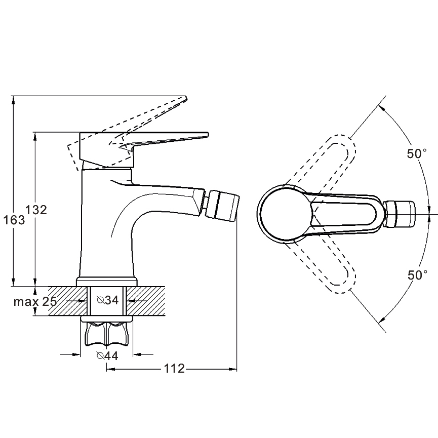 Baterie pentru bideu, maneta unica. Carcasa confecţionata dupa tehnologia moderna „turnare sub presiune”, ceea ce sporește semnificativ termenul de exploatare al bateriei. Se utilizeaza cartușul ceramic silentios Ø35, cu potenţial inalt, la fel aeratorul, care imbunatatește calitatea apei și reduce consumul ei. Se combina excelent cu camera de baie în stil hi-tech.