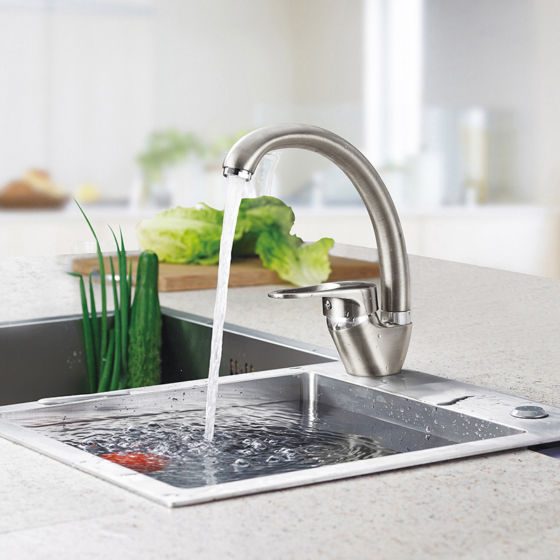 Baterie pentru bucatarie, maneta unica. Carcasa confecţionata dupa tehnologia moderna „turnare sub presiune”, ceea ce sporește semnificativ termenul de exploatare al bateriei. Se utilizeaza cartușul ceramic silentios Ø40, cu potenţial inalt, la fel aeratorul, care imbunatatește calitatea apei și reduce consumul ei.